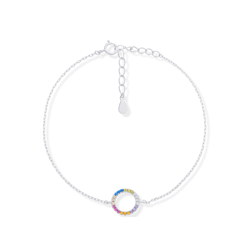 Delikatna srebrna bransoletka z kolorowymi cyrkoniami osadzonymi w kółeczku (1 cm) to perfekcyjne dopełnienie naszyjnika i kolczyków z tej samej kolekcji. Jej lekka forma i tęczowy blask cyrkonii sprawiają, że pasuje zarówno do codziennych stylizacji, jak i eleganckich wyjść.