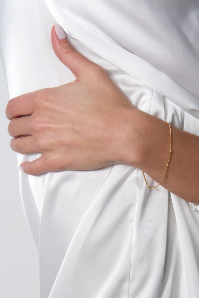 Dodaj swojej stylizacji lekkości i elegancji! Ta delikatna pozłacana bransoletka z drobnymi kuleczkami to idealny wybór dla kobiet, które cenią subtelną, ale efektowną biżuterię. Regulowana długość (16-19 cm) pozwala na perfekcyjne dopasowanie, dzięki czemu nosi się ją wygodnie przez cały dzień. Ciepły odcień złota pięknie podkreśla skórę, a klasyczny design sprawia, że pasuje zarówno do codziennych, jak i wyjątkowych okazji. Noś ją solo lub łącz z inną biżuterią, tworząc modny, wielowarstwowy efekt – elegancja nigdy nie była tak łatwa do osiągnięcia!
