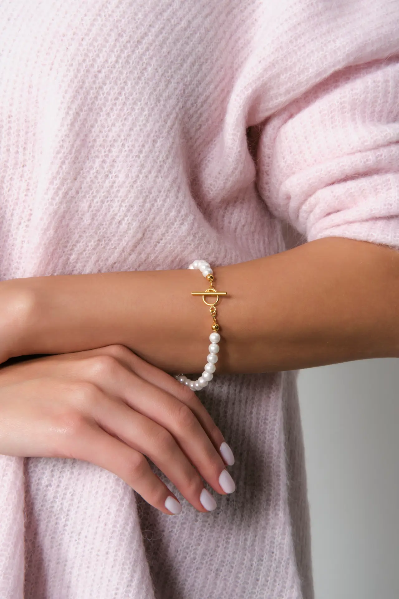 Bransoletka z pereł o średnicy 6mm z dużym zapięciem typu toggle. Pozłocona 24k złotem
