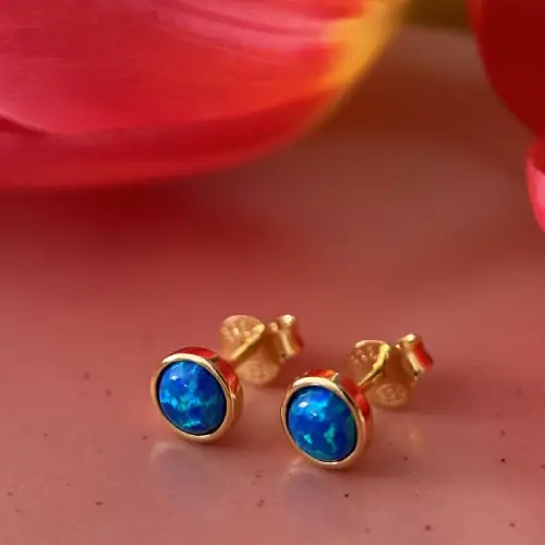 Zatrzymaj magię oceanu przy samej twarzy. Te subtelne, pozłacane kolczyki z niebieskim opalem fascynują głębią błękitu i unikalną grą barw, która zmienia się przy każdym Twoim ruchu. Idealne 6 mm elegancji, które rozświetli spojrzenie i doda lekkości każdej stylizacji.