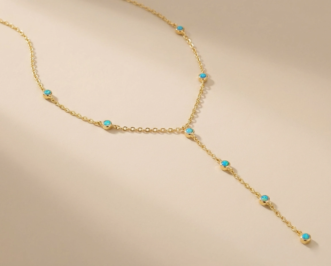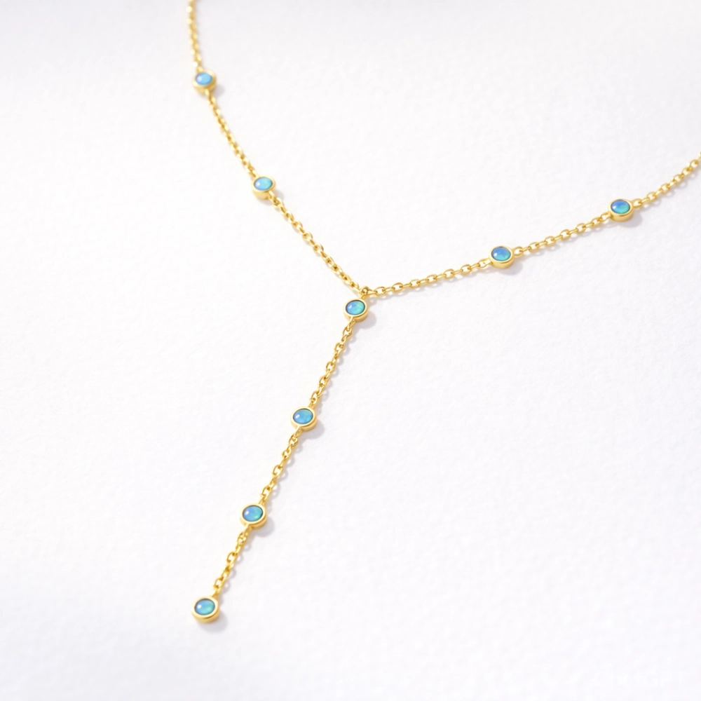 Zmysłowy i niesamowicie kobiecy pozłacany naszyjnik typu krawatka z olśniewającymi, niebieskimi opalami. Wykonany z najwyższej jakości srebra próby 925, idealnie układa się na ciele, subtelnie podkreślając linię dekoltu. Jego hipnotyzujący, błękitny blask przyciąga spojrzenia i dodaje stylizacjom magicznego charakteru.