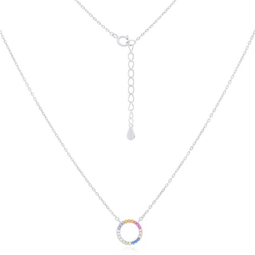Naszyjnik z kolorowymi cyrkoniami osadzonymi w kółeczku. Wykonany ze srebra 925. O długości 42cm.