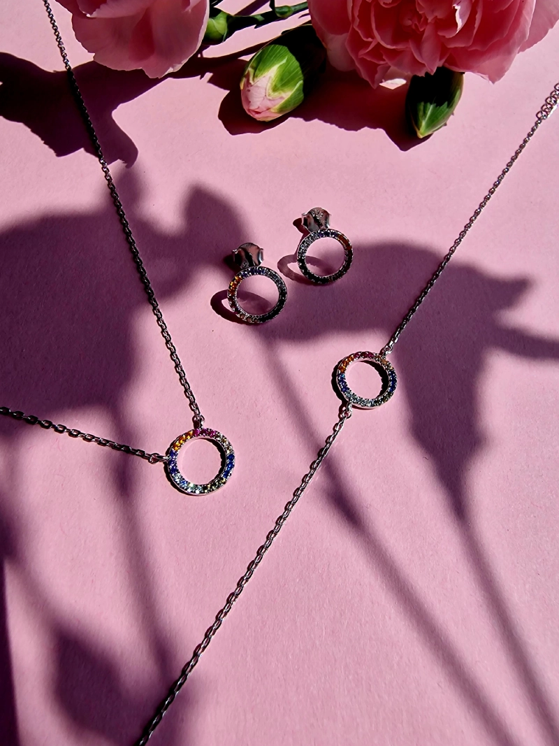 Połączenie klasycznej formy z odrobiną fantazji. W centralnym punkcie lśni kółeczko wypełnione wielobarwnymi kamieniami, które migoczą przy każdym ruchu, dodając biżuterii wyjątkowego uroku. Subtelny, ale pełen blasku!
