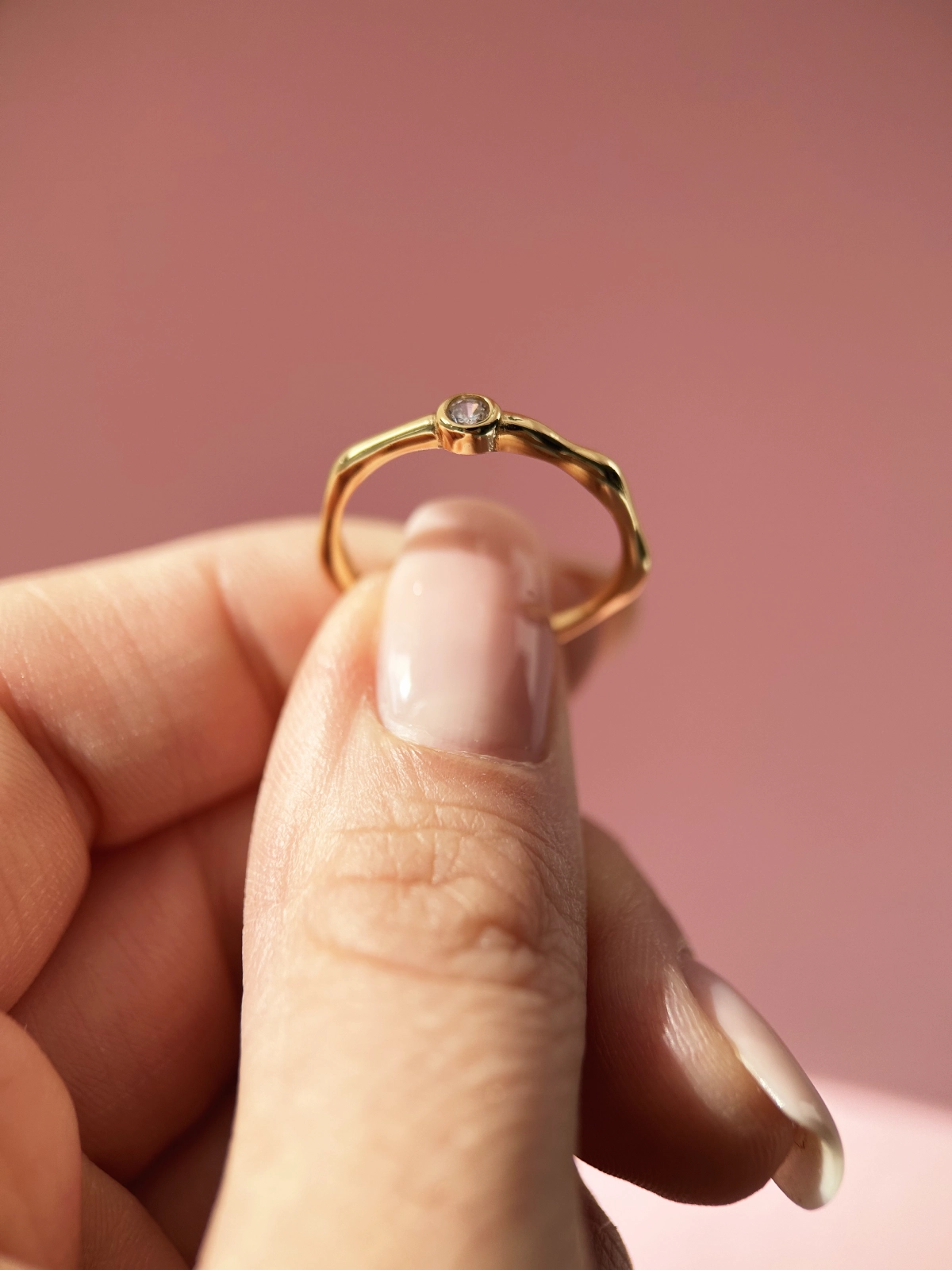 Unikalny, organiczny kształt pierścionka idealnie dopasowuje się do dłoni, a jego nieregularna, pofalowana powierzchnia pięknie odbija światło. W centrum tego designu znajduje się subtelna, biała cyrkonia, która dodaje mu subtelnego blasku i elegancji, podkreślając jego minimalistyczny charakter.
